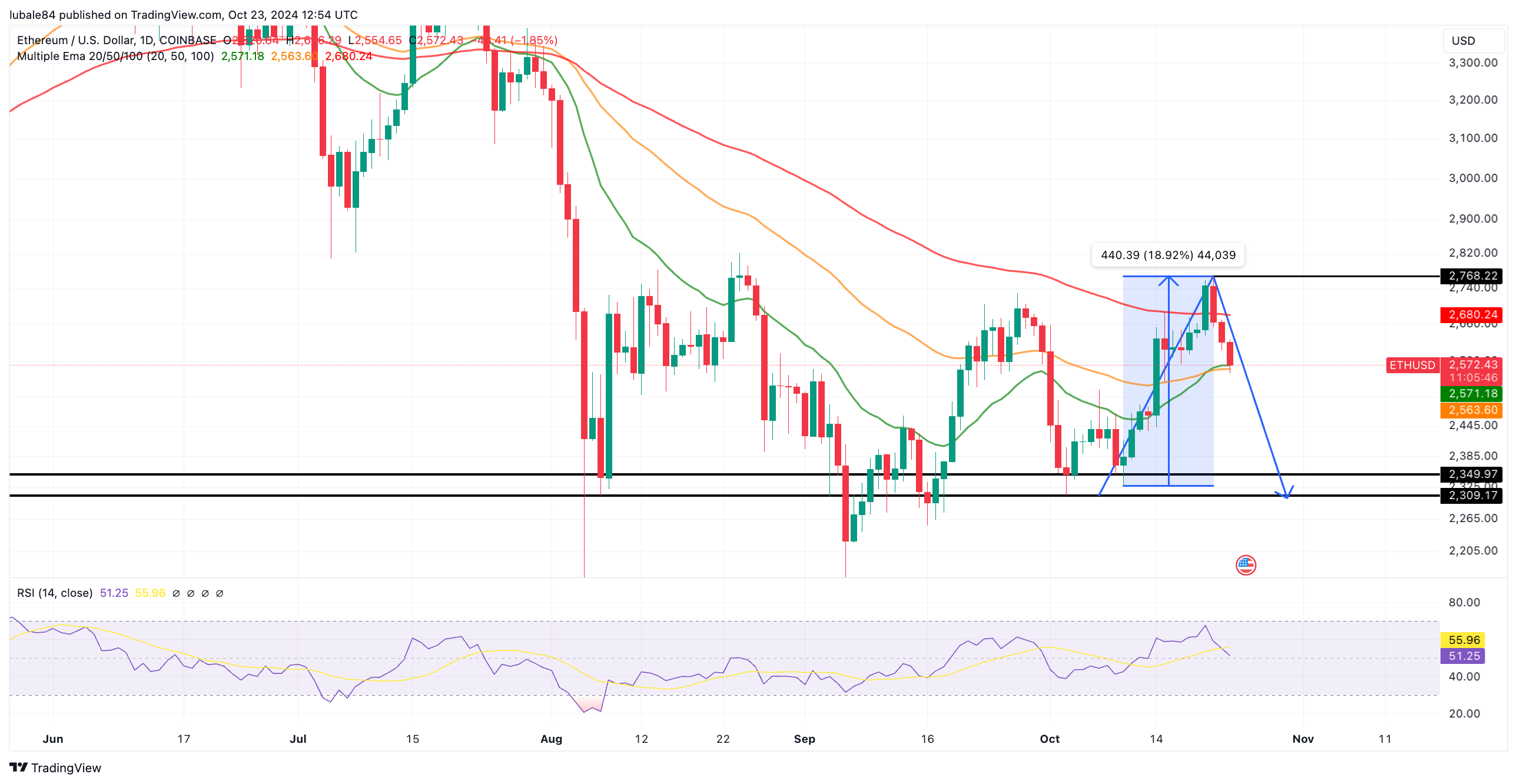 ETH'nin 10 Ekim ile 23 Ekim arasındaki fiyat hareketi, günlük grafikte ters V şeklinde bir model ortaya çıkardı. Bu, Ether fiyatının 2.327 dolardan %19 yükseldiği ve 2.800 dolar civarındaki alıcı sıkışıklığı nedeniyle durdurulan güçlü bir yükselişin ardından gerçekleşti.