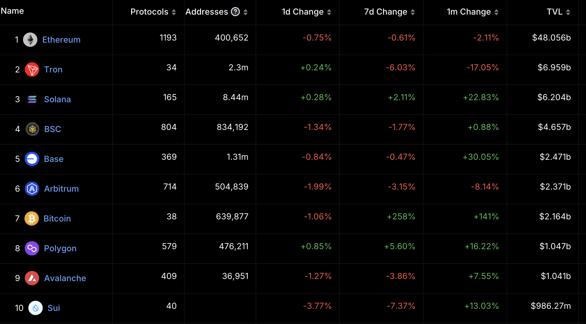 En iyi blockchain ağları: TVL'deki yüzde değişim. Kaynak: DefiLlama